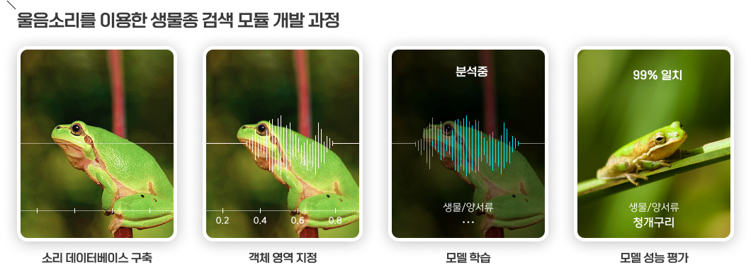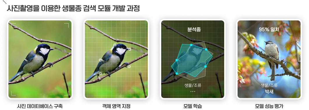 딥러닝 기반 생물 종 이미지 및 조류 울음소리 검색모델을 개발하기 위해 쌍령공원에 우점하고 있는 식물, 포유류, 조류를 대상으로 영상 및 울음 소리 데이터를 수집하였다. 수집된 데이터들은 딥러닝 모델학습에 이용 하였으며 각각의 모델은 이미지 판별 정확도 약 95%, 울음소리 판별은 약 99%의 정확도로 학습하였다.