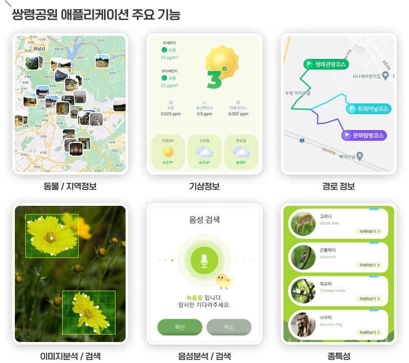 쌍령공원 애플리케이션 주요 기능으로는 기상 정보, 동식물 검색, 지역 예술정보 등으로 구성하여 개발하였다. 기상정보는 공간정보 오픈 플랫폼 연계를 통해 표출하였으며, 지도에 표출되는 서식 생물 및 역사정보는 아이콘으로 시각화하여 사용자가 편리하게 정보를 확인할 수 있도록 구현하였다. 종 특성 목록은 딥러닝 기반 생물종 검색모듈을 구현하여 다양한 생물의 정보를 제공할 수 있도록 개발하였다.