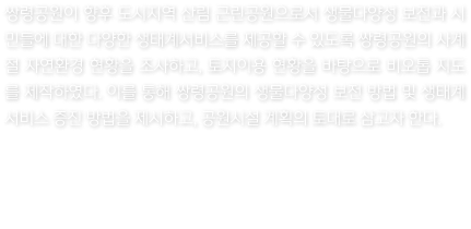최종 연구결과를 바탕으로 생물다양성을 보전하고, 생태계서비스를 증진하는 쌍령공원의 관리계획을 도출하였다. 쌍령공원은 도시외곽 지역의 산림형 공원 특성상 다양한 생물상을 가지고 있고, 이를 활용한 생태체험학습을 진행할 수 있다. 아파트 주민 및 인근 주거시민을 대상으로 공원 시설물을 활용한 생태체험 프로그램을 진행한다면, 쌍령공원의 문화서비스와 더불어 주민들의 환경 보호인식도 함께 증진될 것으로 기대된다.