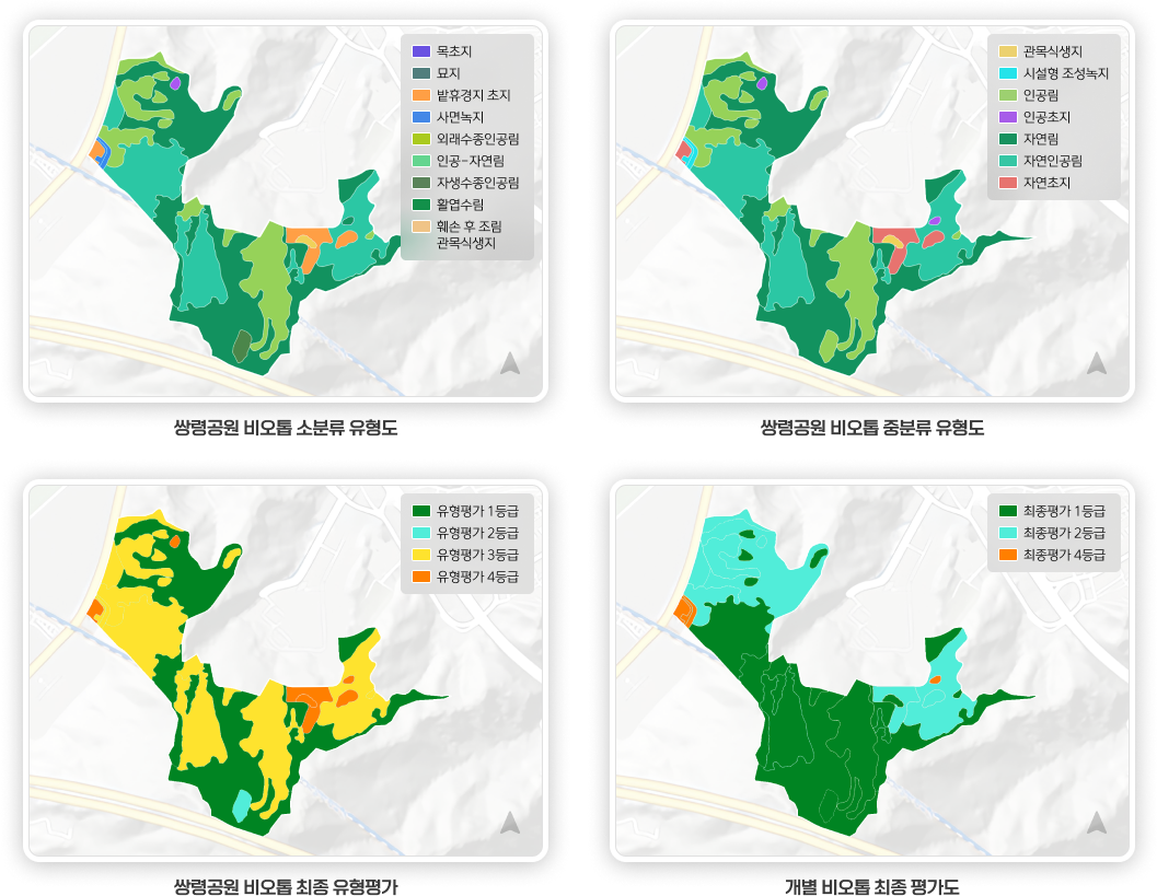 경기도 광주시의 비오톱 평가체계에 따라 쌍령공원의비오톱 유형은 대분류로 산림, 조성녹지, 초지로 구분되며, 중·소분류까지 세분화하여 최종비오톱 유형 평가를 진행한 결과, 전체 면적 중 3등급 비오톱이 가장 많고(49.89%), 다음으로 1등급 비오톱(44.62%)이 가장 많았다.