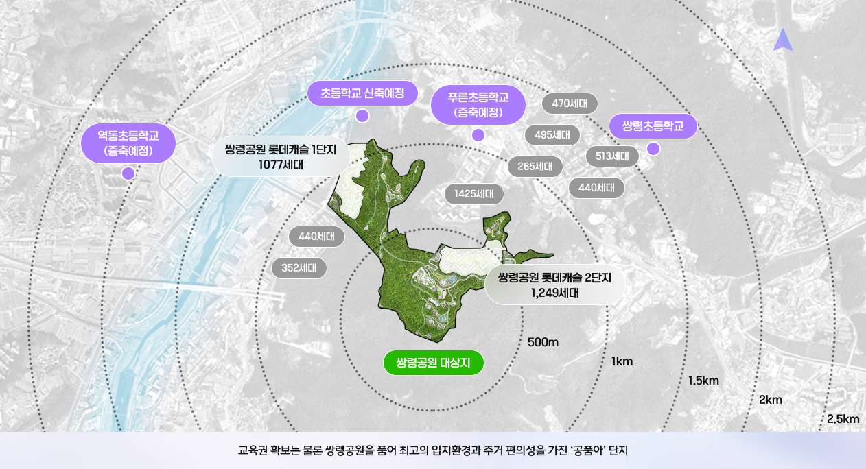 쌍령공원은 반경 1km 내 초등학교 2개소, 2km 내 고등학교 1개소가 위치해 있어 교육권 확보 측면에서도 우수하다. 집과 학교가 가까워 자녀의 안전한 통학이 가능하고, 공원과 연계한 자연학습 및 체험 활동이 가능해 학습 분위기 조성에도 유리하다. 이러한 요소는 지역 내 높은 관심과 인기를 끌 것으로 기대된다.